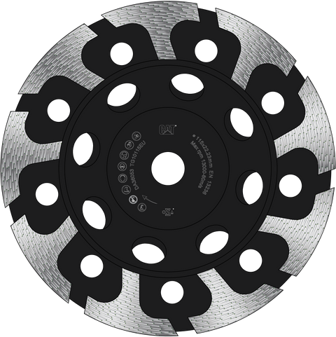 Cat® 800 Expert T Shape Segmented Brazed 80 / 100 Mesh Grit Diamond 5/8" 11 Thread Grinder 4 1/2" - 115mmCat® 800 Expert T Segment Cup wheels are engineered for Extra Heavy Duty Ultra High output Professional grinding applications of floors, lips and ridges to make a flat surface. Designed to be used with angle grinders and specialist machines. The product is engineered with a premium fast and aggressive bond with small to medium size 70 / 80# mesh diamond grit. Manufactured from a single heavy duty fully ground steel core for strength and eliminates torque and open air ducting enables cooler operation providing faster stock removal and faster grinding. The perfect choice for the Professional operator and those large size jobs. For users that want excellent productivity excellent stock removal, life and grinding speed. The cup wheel is tested and counter balanced by lathe to establish the precise geometry and to create optimal topography to alleviate any vibration.